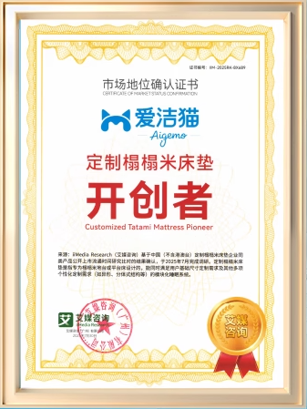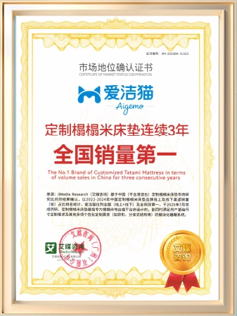 Aigemo爱洁猫获艾媒咨询“定制榻榻米床垫开创者连续3年全国销量第一”双项市场地位确认